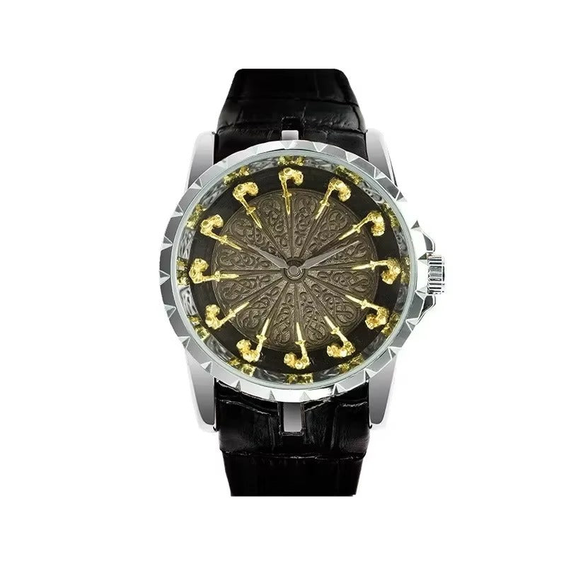 Encircling the dial, twelve golden knights stand in silent vigilance — each representing an hour, a guardian of every moment. Their intricate armor, inspired by medieval craftsmanship, transforms the watch face into a living story of strength and honor.